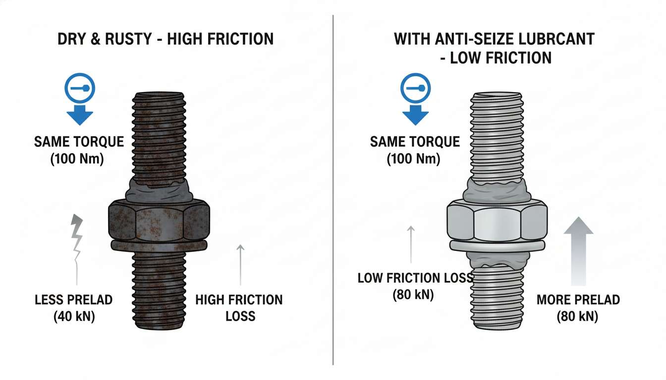 Dampak Pelumas: Penggunaan pelumas seperti anti-seize (misalnya, berdasarkan tembaga atau moly) secara signifikan mengurangi faktor gesekan (K).