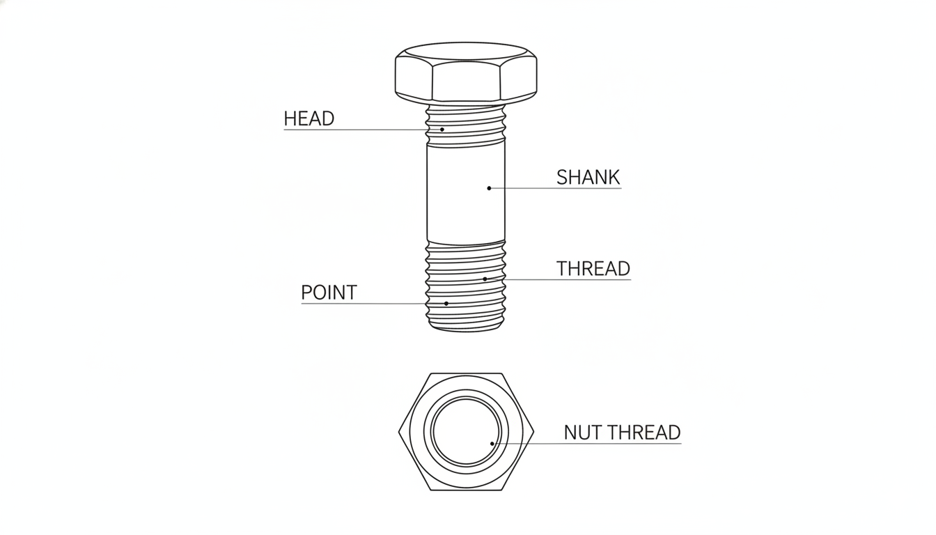 Point (Ujung): Bentuk ujung baut (misalnya chamfered atau flat) yang membantu mempermudah pemasangan mur.